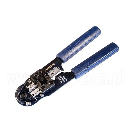 Zaciskarka złączy modularnych 10p10c, obcinarka i ściągacz izolacji. Konstrukcja stalowa, ramiona pokryte miękkim tworzywem, posiada blokadę otwarcia.