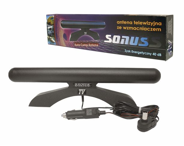 AutoCamp Antena Sonus TV Aktywna antena telewizyjna z gniazdem zapalniczki Antena TV UHF / VHF Doskonały odbiór wszystkich programów TV Nadaje się zarówno do analogowego jak i cyfrowego odbioru Wzmocnienie 25dB 12 miesięcy gwarancji Po rozpakowaniu antena jest gotowa do podłączenia Zasilanie 12 V z gniazdka zapalniczki samochodowej Antena telewizyjna SONUS TV przeznaczona jest do odbioru sygnałów w trzecim (kanały 6 do 12), czwartym i piątym (kanały 21 do 6)