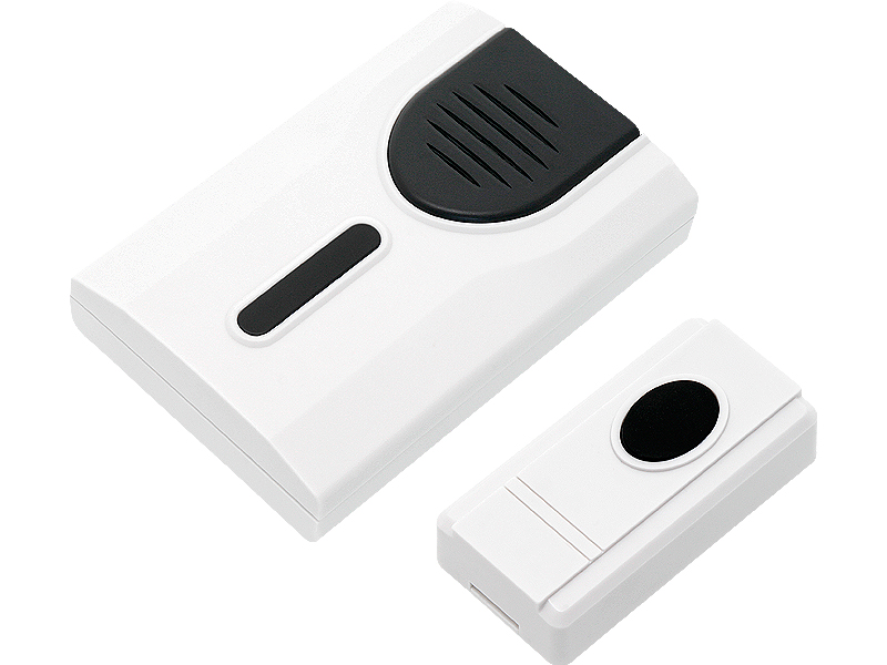 Bezprzewodowy dzwonek z mozliwością samodzielnego ustawiania dźwięku. Wybór spośród 32 dostepnych melodii. Konstrukcja nadajnika odporna na wilgoć.